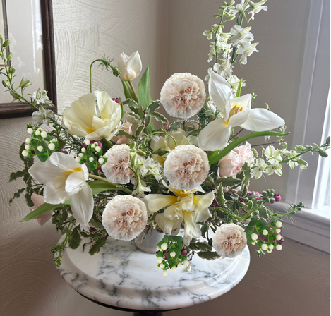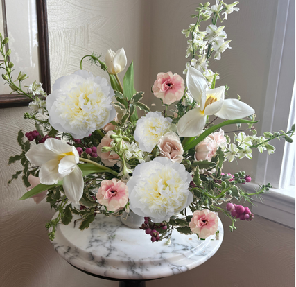 A more Lux option would be replacing some of the tulips with peonies or garden roses, and some of the spray roses with butterfly ranunculus. This adds a more diverse grouping of florals, which will enhance the interest of the arrangement. The price of this would be $160.00.